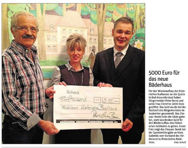Bericht über die Spende von Christine und Peter Berek, die bei ihrer Hochzeit anstatt Geschenken um eine Spende für den Wiederaufbau des Historischen Badehauses gebeten hatten. Dabei kamen knapp 5000 Euro zusammen, die vom Ehepaar Berek auf den runden Betrag aufgefüllt wurden.
